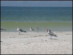 The day started off again with a lot of sunshine. We’re slowly reaching vacation mode. It’s getting more difficult to get up in the morning. We quickly agreed upon a beach day. We enjoyed Lovers Key two years ago, so we decided to head for that beach again. Little did we know that road construction was going on on Ft. Myers Beach. It is interesting to compare the differences of how people drive and what jobs people have during a road construction. Whereas we in Europe work with traffic lights, here people stand in the sweltering heat (95F) holding signs with one side „slow“ and the other side „stop“. It took a bit longer to get to the beach, but we had enough protection with us to keep us from getting sunburnt. When we arrived at the State Park, we were welcomed by a friendly official, who confirmed that the entry fee had not changed in 2 years. We paid 8$ for entry and parking. We didn’t have to wait long for the tram to take us to the beach. Even though the tram was full, the beach was nearly empty, the driver told us that the water temperature was 87F. That sounded warm. It was. Never was I so fast under water than this morning. It felt like swimming in a bathtub. We saw dolphins, pelicans, seagulls and other birds. When we took out our sandwiches for lunch we were quickly surrounded by seagulls, but we did not feed them. But it was fun watching them surround us. At the moment the men are busy cracking coconuts.